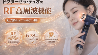 注目してほしいのは「6.78MHz」というRF周波数の数値です。家庭用美顔器の多くはRF周波数を公表していないか、低い数値にとどまります。ドクターセラ・デュオがこの数値を明示していること自体、製品への自信の表れだと感じました。